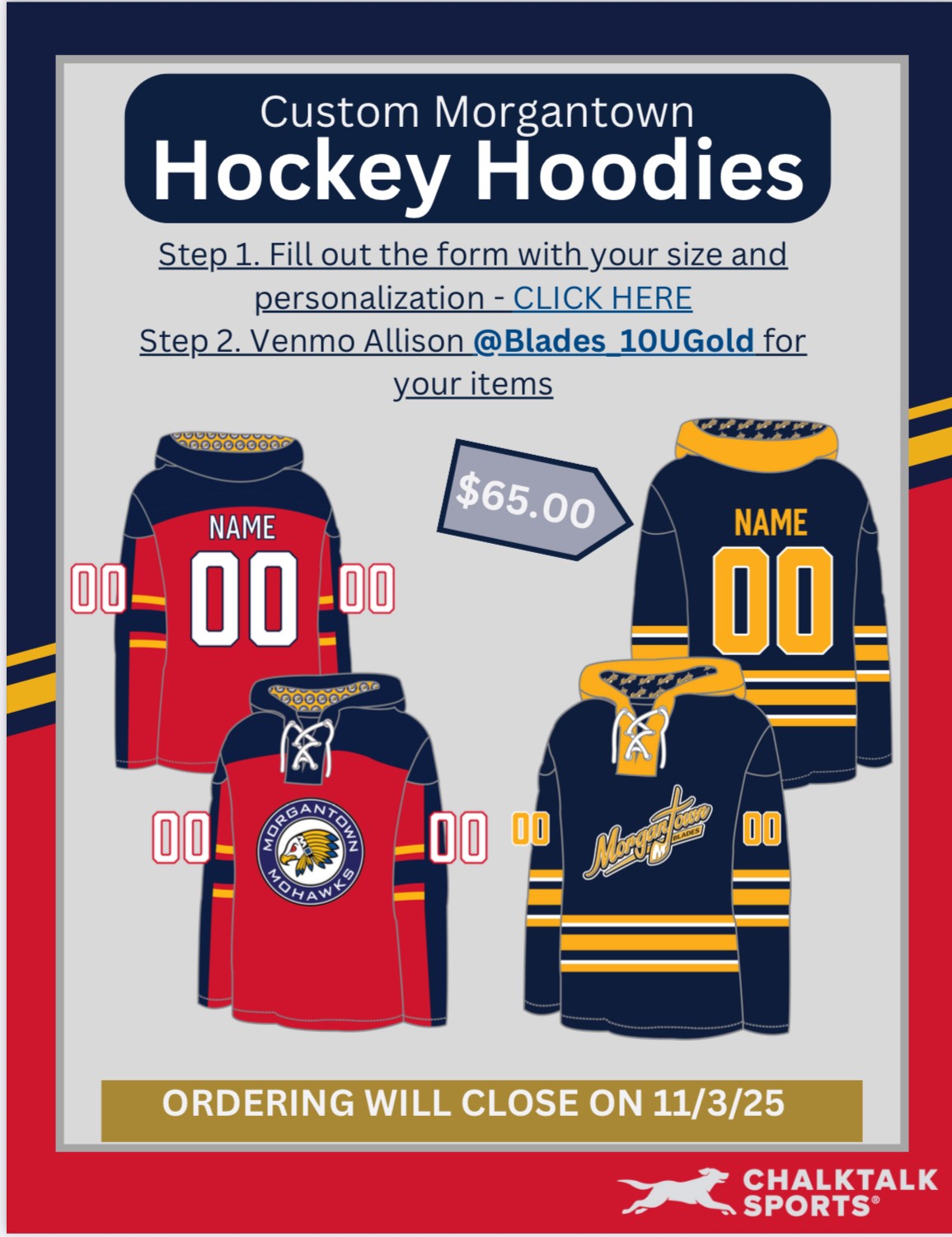 Custom Game day Hoodies available for both Blades and Mohawks! $65 each and will arrive before Christmas!