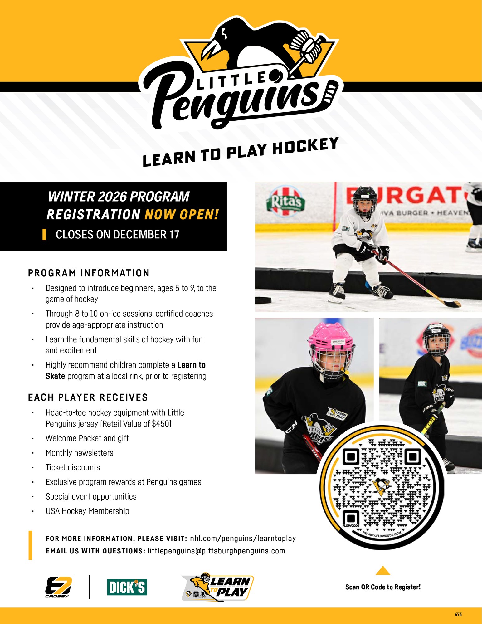 Sidney Crosby's Little Penguins Learn to Play Hockey is an introductory program for children ages 5 to 9 to learn the fundamental skills of hockey in a fun and safe environment. The program consists of eight to ten sessions of on-ice instruction by certified coaches. Little Penguins participants will receive head-to-toe equipment, a monthly newsletter with exclusive content, discounts on Penguins tickets, exclusive program rewards at Penguins games, special event opportunities, as well as a welcome packet and gift. The Little Penguins program is presented by the NHL and NHLPA with the support of Crosby, DICK'S Sporting Goods and USA Hockey. The Learn to Play program began in Pittsburgh in 2008 and has since become a league-wide initiative for the NHL.